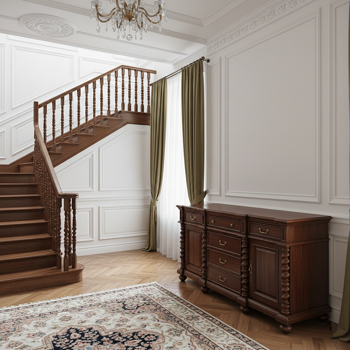 Repeating the motif of staircase balusters in the supports of case furniture is not a passing trend, but a centuries-old principle of classic design. The great interiors of the past — from the palaces of Versailles to Victorian-era English mansions — were built on such echoes: the form of columns was repeated in table legs, the ornament on a mantelpiece was repeated in the carving on chair backs, the profile of a terrace balustrade was repeated in the supports of a sideboard in the dining room.