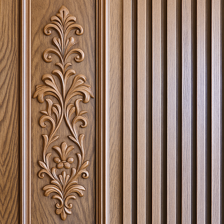 The language of ornament and the language of line — two facets of architectural expression that, in harmony, create spaces of true beauty.Wooden plankForms a geometric frame — strict, rational, orderly.wooden ornamentFills this frame with emotion, symbolism, cultural memory.