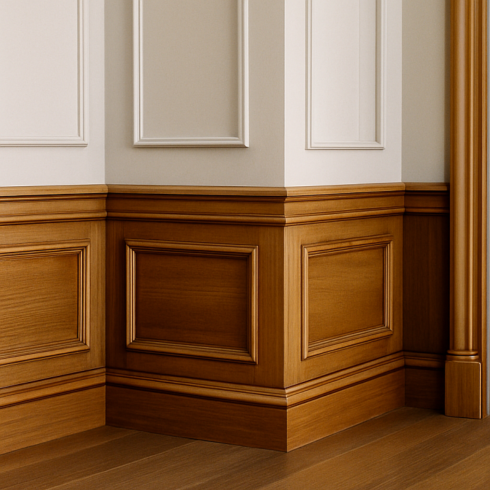 Solid wood moldingsFor panels, it has a simplified profile compared to the baseboard and cornice. Usually, it consists of one or two elements — a cove and a shelf, or a bead and a shelf. This simplification prevents excessive ornamentation, preserving the clarity of the panel geometry.