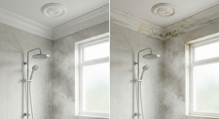 The bathroom is a space where humidity regularly spikes to eighty to ninety percent. A hot shower creates a cloud of steam that condenses on all cold surfaces. The ceiling, cornices, and outlets become covered in micro-droplets of water.