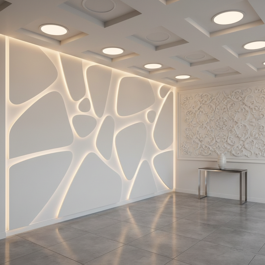 The variety of reliefs is enormous. Geometric patterns — squares, rhombuses, honeycombs, waves — for modern interiors. Floral ornaments — leaves, flowers, climbing stems — for classic and eco-styles. Abstract compositions — chaotic protrusions, organic forms — for avant-garde spaces.
