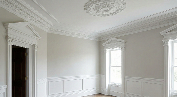 Классический стиль требует полного арсенала лепного декора. Высокие карнизы с богатым орнаментом, широкие плинтусы, пилястры с ордерными капителями, потолочные розетки под люстры, молдинги, создающие настенные панели. Орнаменты античные — акант, меандр, пальметты. Цветовая гамма светлая — белый, кремовый, с возможным золочением деталей. Это дворцовая эстетика, требующая больших пространств и соответствующей мебели.