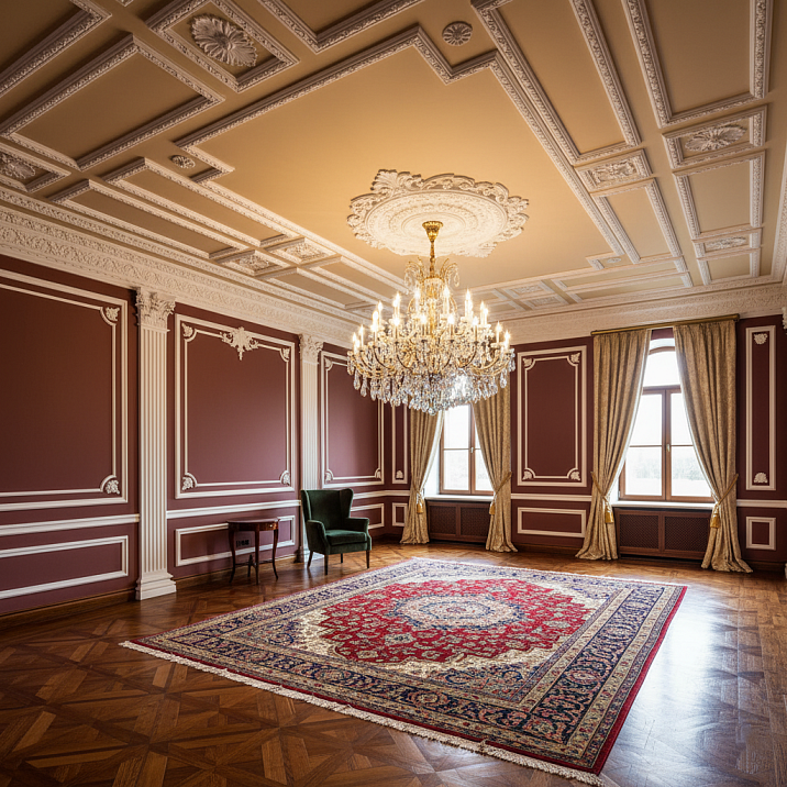 , should proportionally correspond to ceiling compositions. If the ceiling is divided into 80x80 cm coffered panels, wall panels can be 60x90 cm - similar but not identical in size, creating visual continuity without monotony.moldingsshould proportionally relate to ceiling compositions. If the ceiling is divided into coffers measuring 80x80 centimeters, wall panels can be 60x90 centimeters - a similar but not identical size, creating visual connection without monotony.