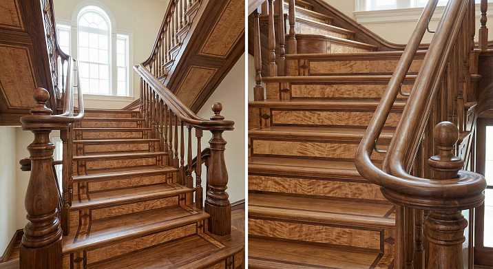 Если на стенах используется резная раскладка (например, с растительным орнаментом), можно заказать резные балясины с тем же орнаментом. Повторяющиеся мотивы (листья аканта, виноградные лозы, геометрические меандры) связывают пространство, создают ощущение продуманного дизайна.