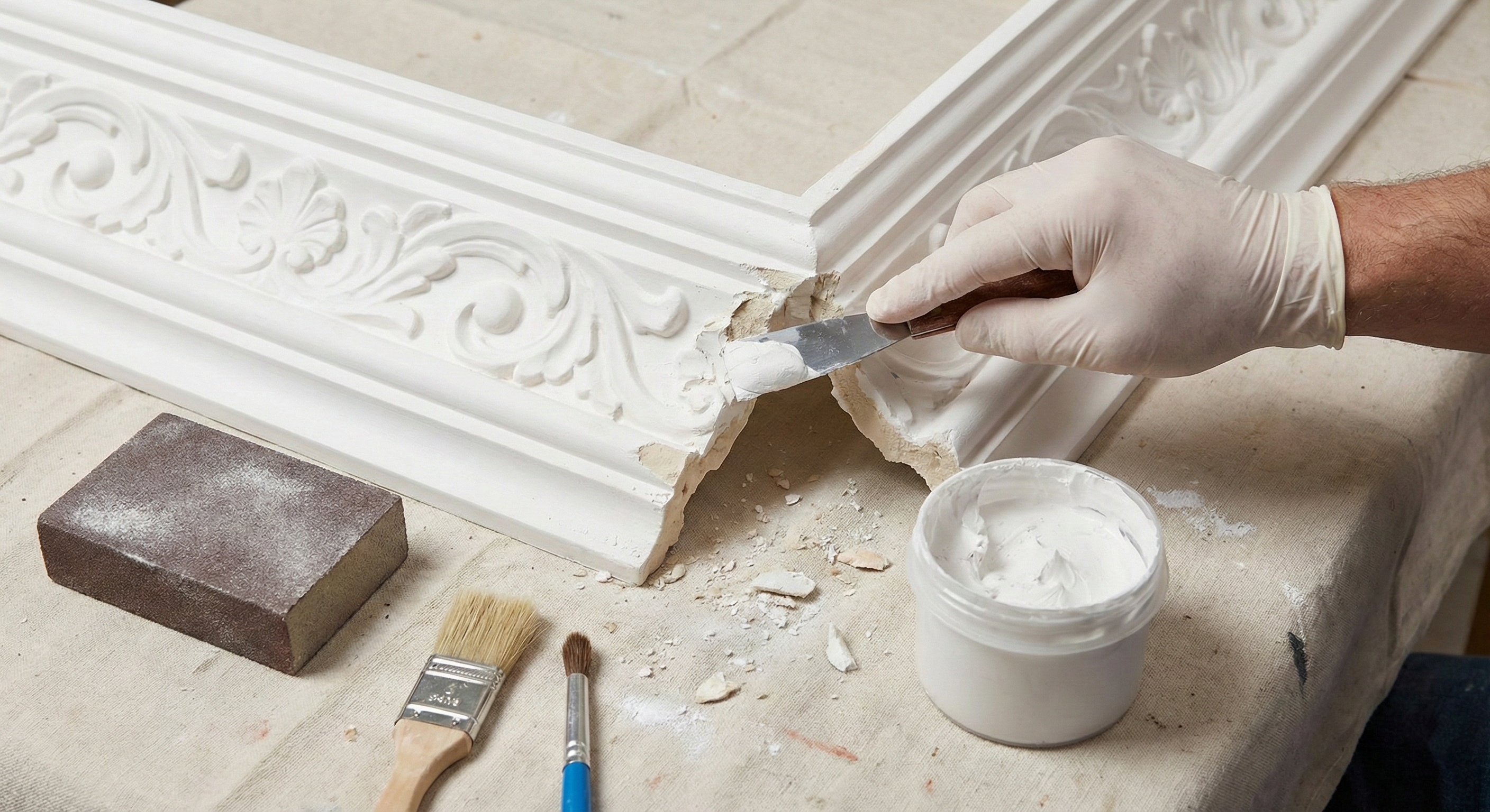 If you are starting a renovation, rearranging furniture, painting walls — protect the moldings. Cover with painter's tape, cover with film. A stepladder being moved around the room is a common cause of chips on cornices.