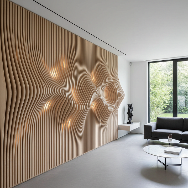Modern designers have discovered unlimited possibilities for using beech strips in interior solutions. Zoning of space usingdecorative wooden stripsallows creating functional partitions without losing the sense of spaciousness. Vertically oriented strips visually increase ceiling height, while horizontal placement expands the space.