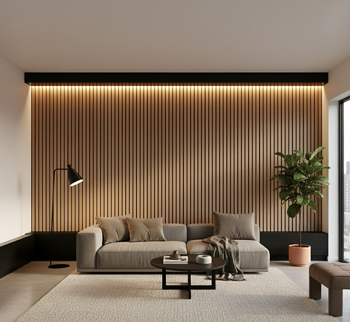 Role of slats: Creating accent walls that do not overwhelm the interior but add tactile warmth and texture. Often, walls behind sofas or beds are clad with slats.