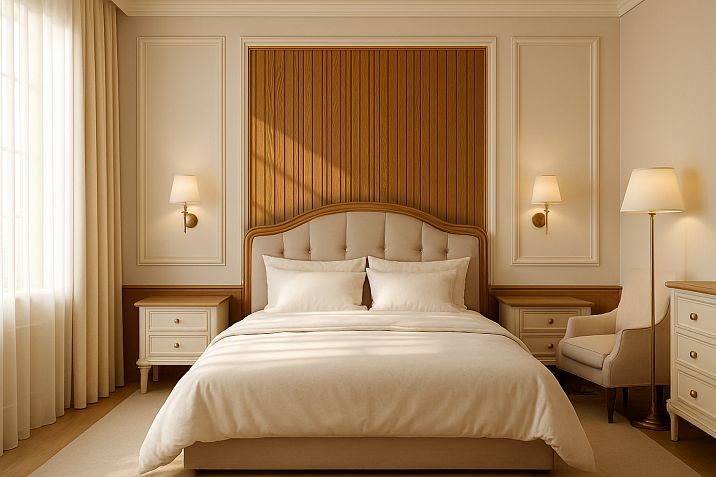 Horizontal Placement MDF rail on the wall It works in the opposite direction — it visually expands the space. This technique is especially effective in narrow spaces such as hallways or small bedrooms. Horizontal rails create a sense of calm and stability, making them an ideal choice for relaxation zones.