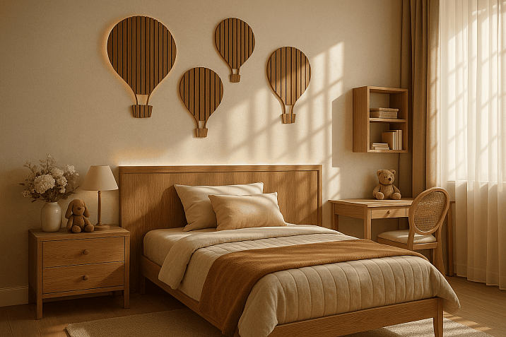 Accent colors are used sparingly to create compositional centers. One or two bright elements against a calm oak veneer create refined interior compositions without excessive clutter.