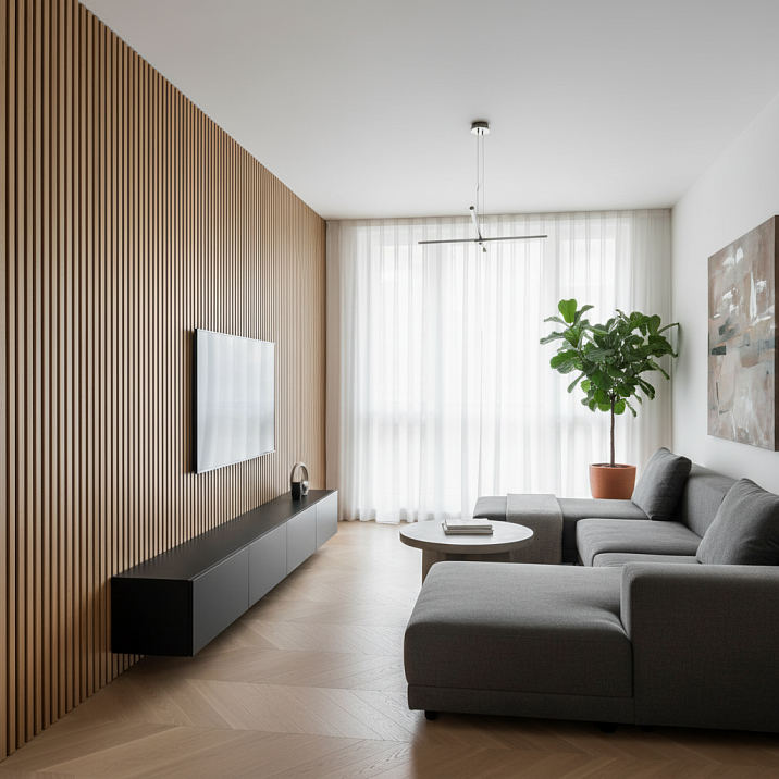 The philosophy of minimalism finds its ideal embodiment in using wooden slats as the sole decorative accent in interior design. Clean lines, natural colors, and simple forms create a space where each element has both functional value and aesthetic significance.
