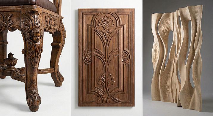 Modern interiors do not exclude carving but require restraint. Minimalist carving—simple geometric shapes, low relief, laconic ornaments. One or two carved overlays as accents, not covering the entire surface.