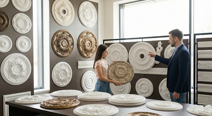 Style matching is essential: classical rosettes (with acanthus, egg-and-dart, dentils, meander, palmettes, diameters 400-1200 mm) for classical interiors and traditional chandeliers, Baroque rosettes (with garlands, putti, cartouches, shells, volutes, diameters 700-1500 mm, relief depth 20-40 mm) for palatial interiors and opulent multi-arm chandeliers, minimalist rosettes (concentric circles without ornament, diameters 300-700 mm, relief 5-12 mm) for modern interiors and sleek light fixtures, geometric rosettes (Art Deco, Art Nouveau, diameters 400-900 mm) for designer projects and unusual chandeliers.