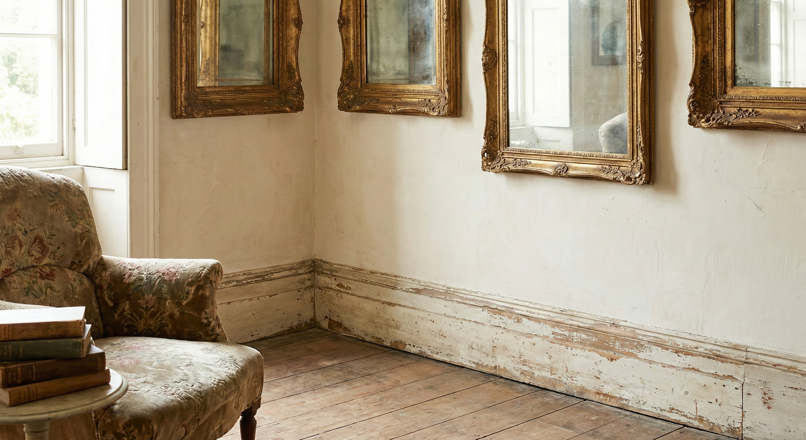 A vintage interior withold wooden baseboardsandantique mirrors in wooden frames— is not an attempt to escape from the present into the past. It is a conscious choice of aesthetics that values history, acknowledges the beauty of imperfection, and sees value in things that have passed through time. When a brushed baseboard with patina runs along the perimeter of a room, it creates an architectural foundation bearing the imprint of decades. When an antique mirror in a carved frame hangs on the wall, it becomes a portal connecting the present with the past, reflecting not only the room but also time.