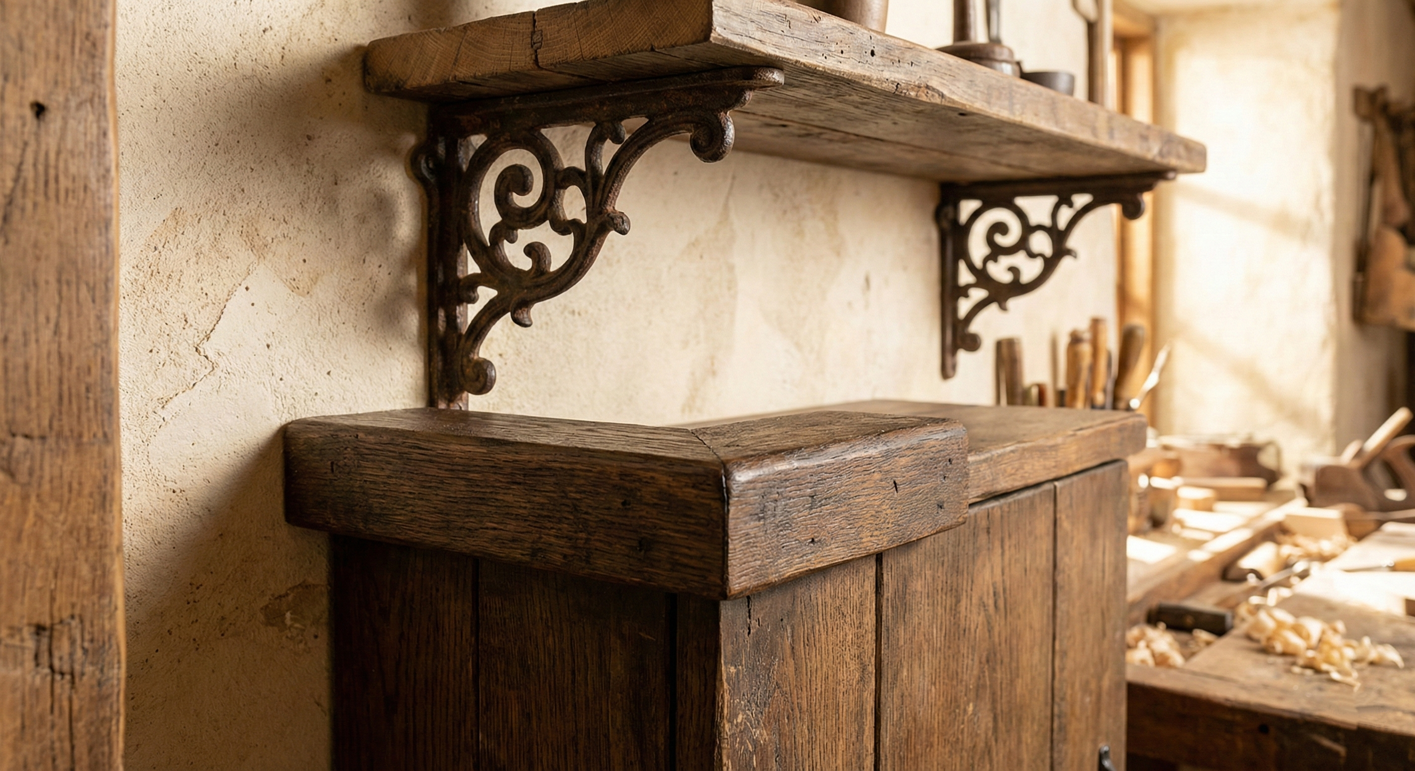 Carved brackets with plant ornamentation are a typical element of Baroque, Rococo, and Victorian styles. The brace is decorated with acanthus leaves, grapevines, floral garlands. Carving can cover the entire surface or concentrate on key points—at the junction of the vertical and the brace, at the end of the horizontal shelf. Gilding or patination emphasizes the relief, creating the effect of an antique piece.