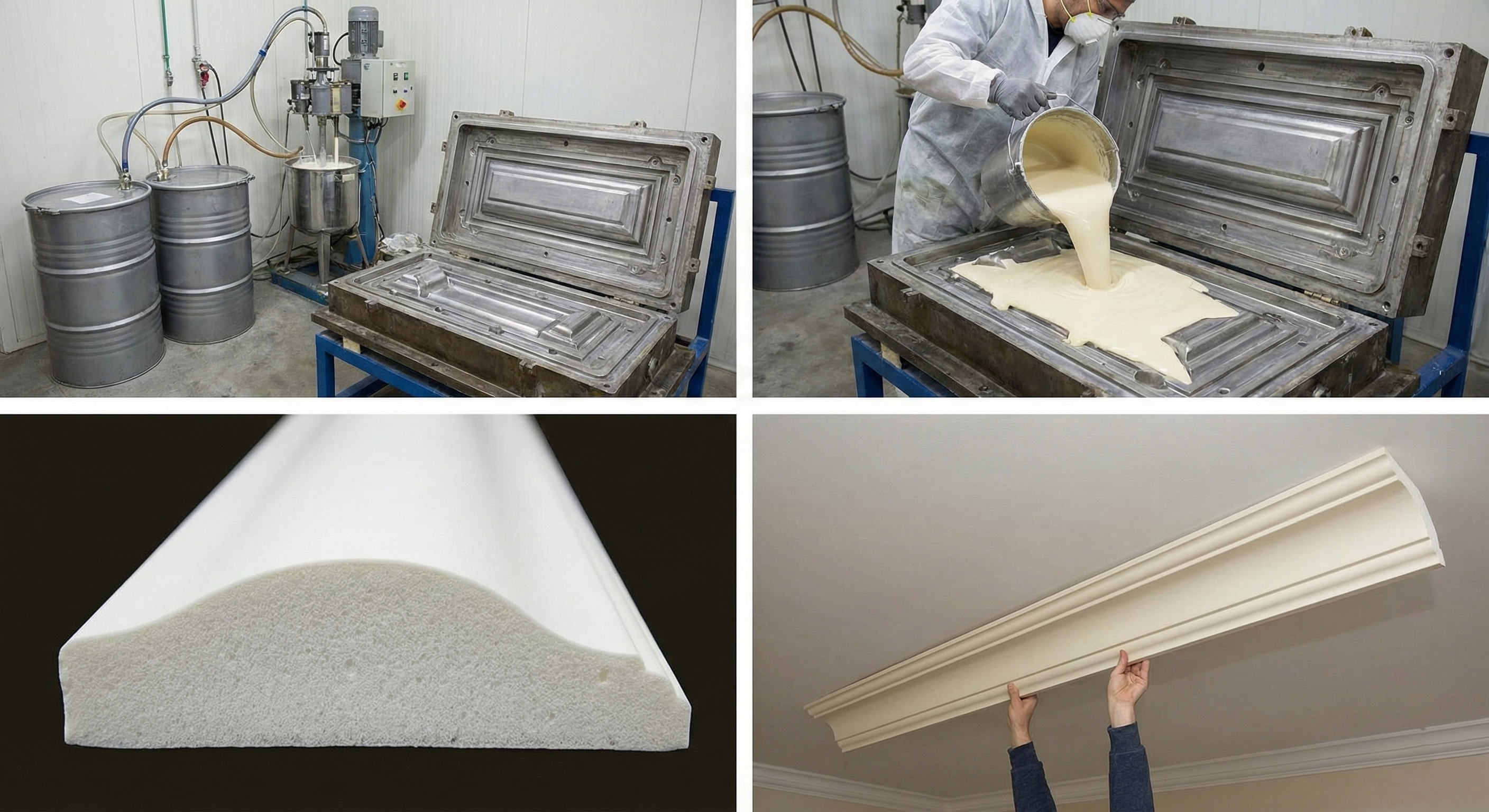 What polyurethane molding consists of? The base — two liquid components. Polyol (polyhydric alcohol — polyether or polyester base, molecular weight several thousand daltons) and polyisocyanate (organic compound with reactive NCO groups — typically methylene diphenyl diisocyanate, abbreviated MDI). Upon mixing, a polyaddition reaction occurs — isocyanate groups react with hydroxyl groups of the polyol, urethane bonds form, creating a polymer network. Additionally, the composition includes catalysts (accelerate the reaction — tertiary amines, tin compounds), blowing agents (create porous structure — water, carbon dioxide, pentane), foam stabilizers (silicone additives, maintain cell structure), flame retardants (reduce flammability — organophosphorus compounds, halogen-containing additives), pigments (if colored polyurethane is needed). All components undergo safety control — after complete polymerization, polyurethane is inert, does not release volatile substances, safe for residential premises.