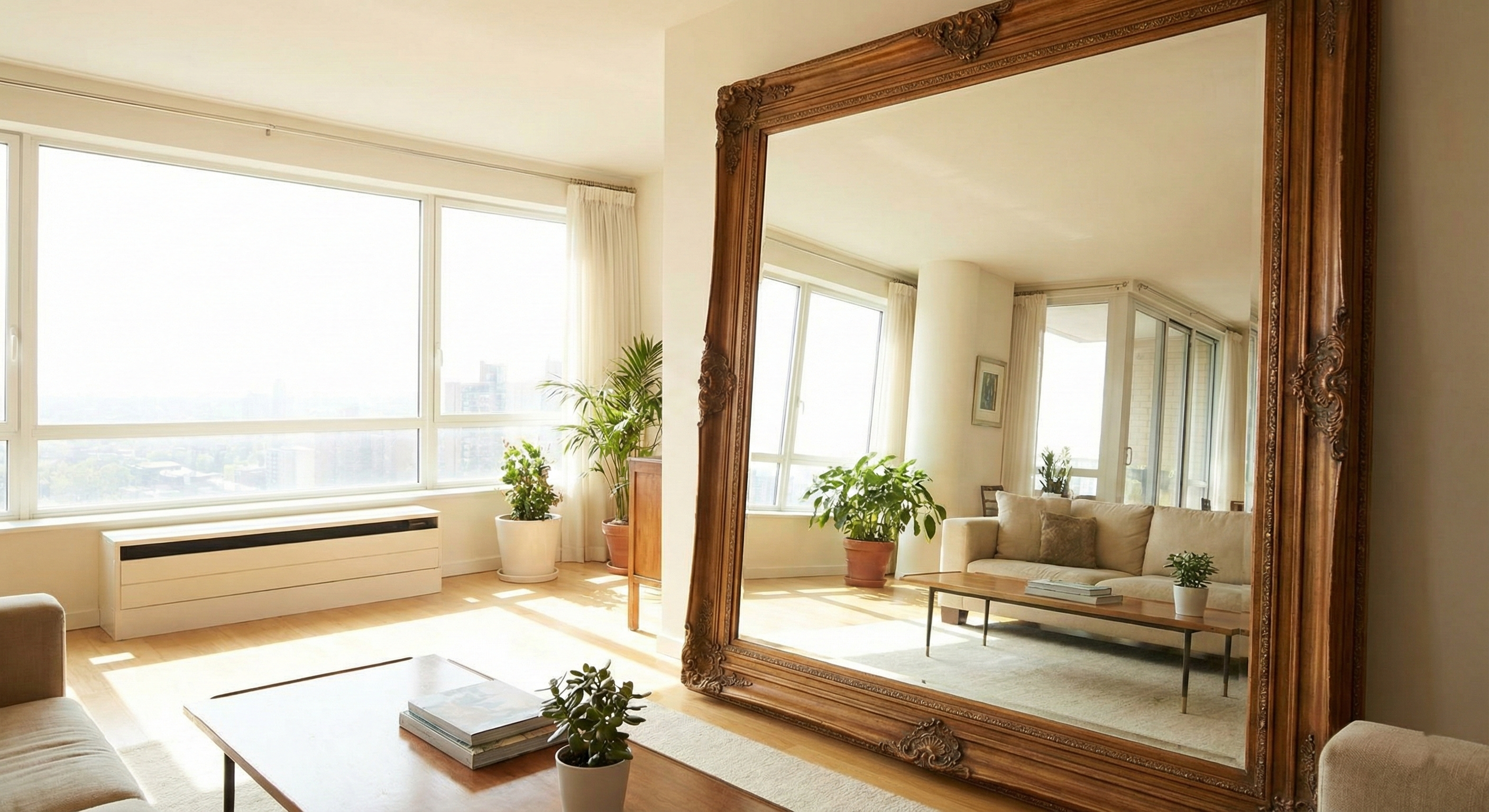 Математика проста: зеркало размером 180×120 см отражает примерно 2,16 квадратных метра пространства. Если в отражении видна комната — эти метры визуально добавляются к реальной площади. Конечно, физически комната не увеличивается, но психологически, визуально — ощущение простора возрастает вдвое.