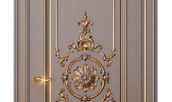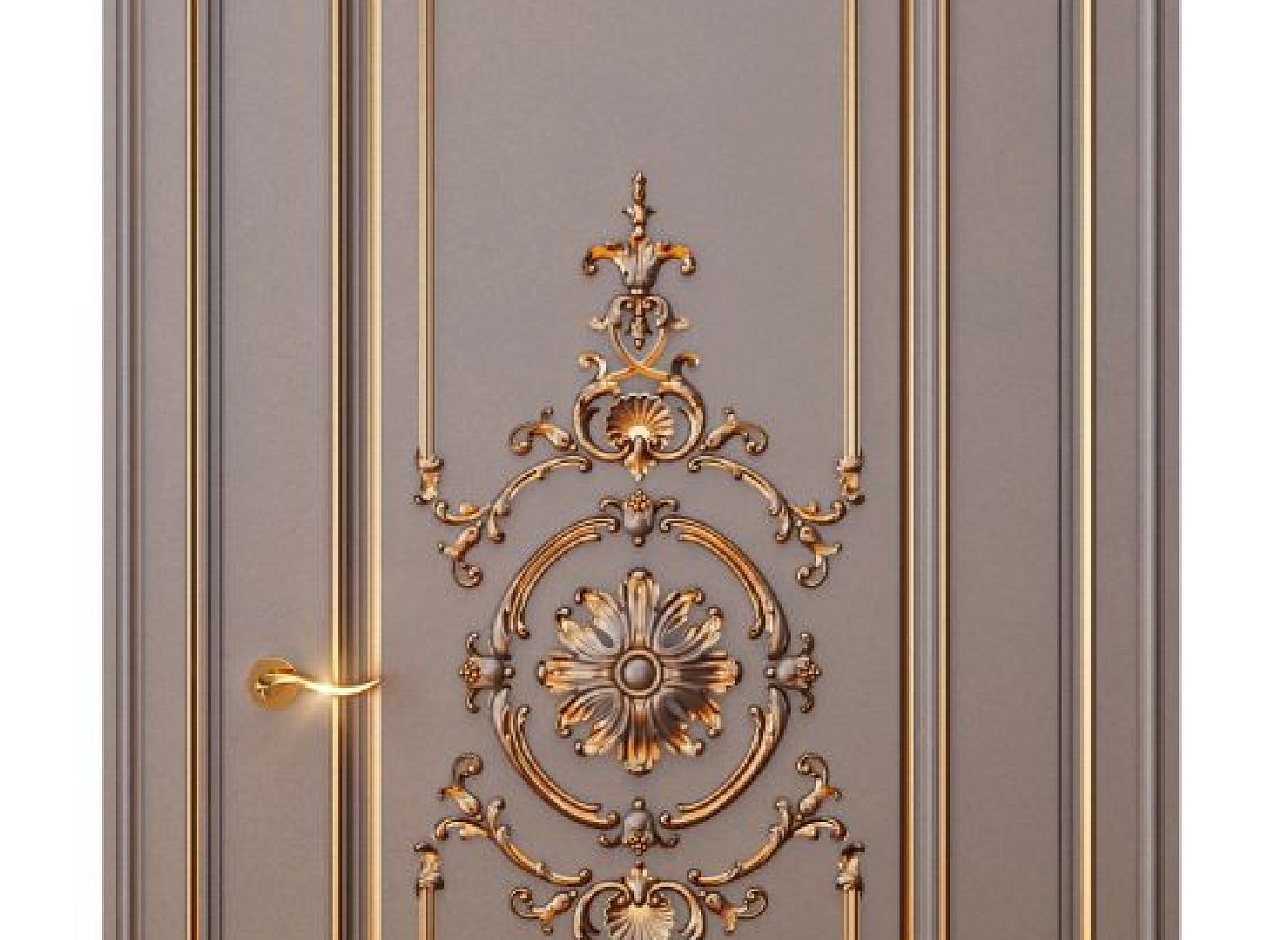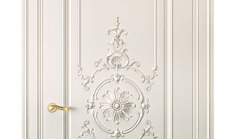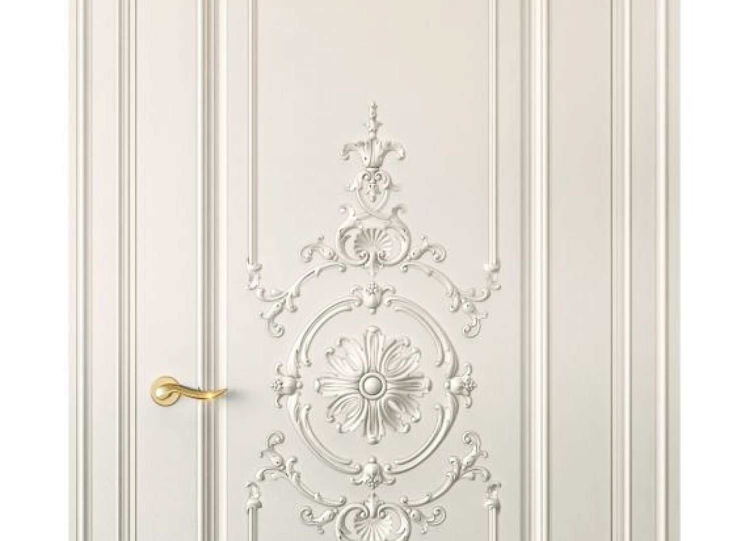 A round rosette is located at the center of the door panel, framed by an exquisite composition of stylized floral patterns and shells. Elegant corner elements, connected by delicate moldings, complete the design and create a unified decorative ensemble.