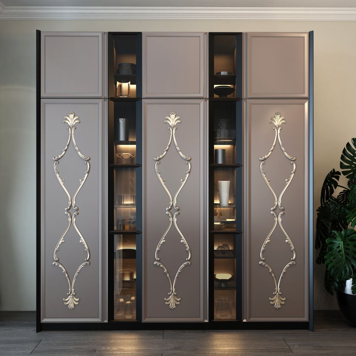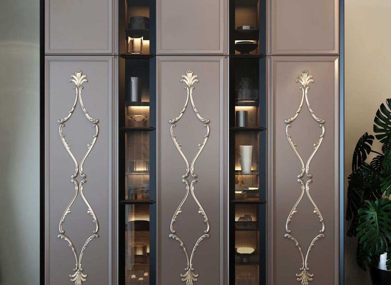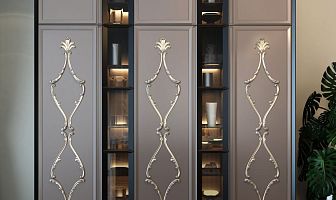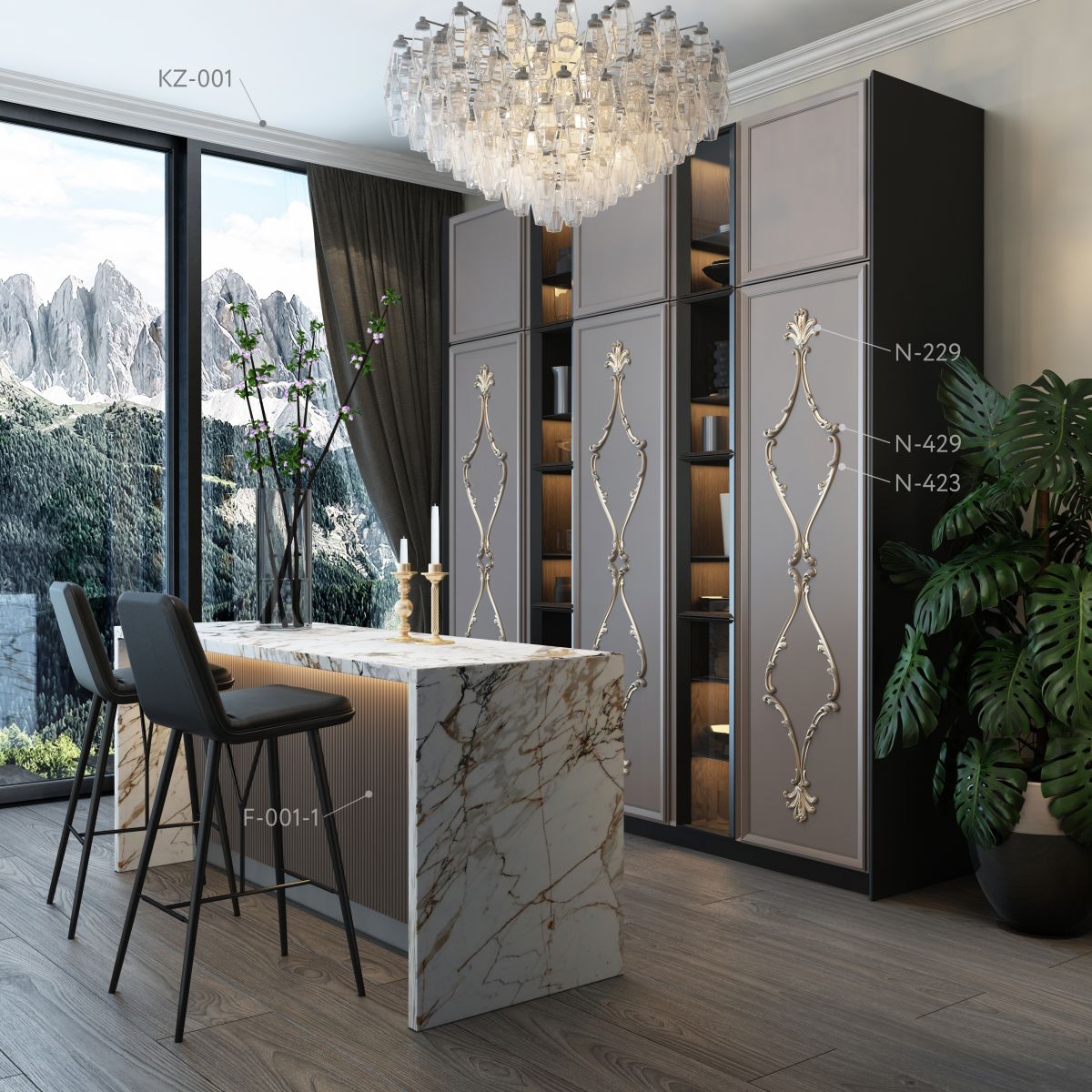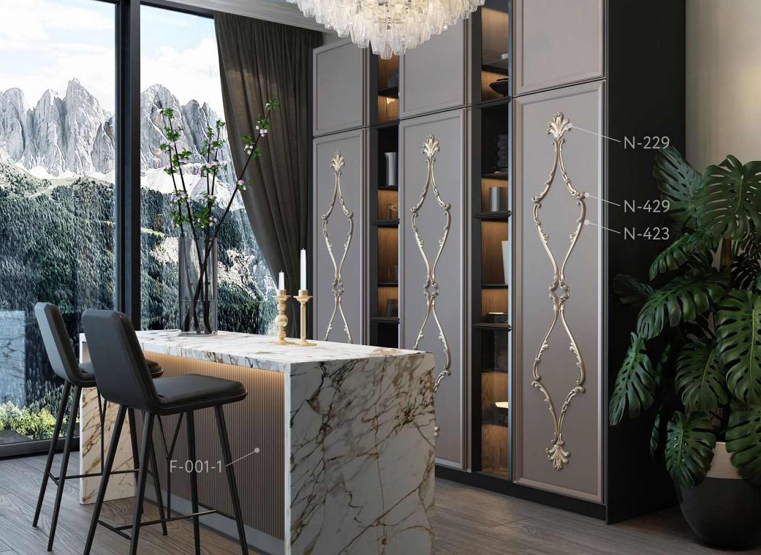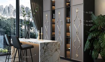 This project demonstrates how, with Stavros decoration, furniture can be given a striking individuality. The kitchen cabinet doors are adorned with an elegant composition of overlays N-229, N-429, and N-423, and the bar counter is enhanced with a relief texture F-001-2.