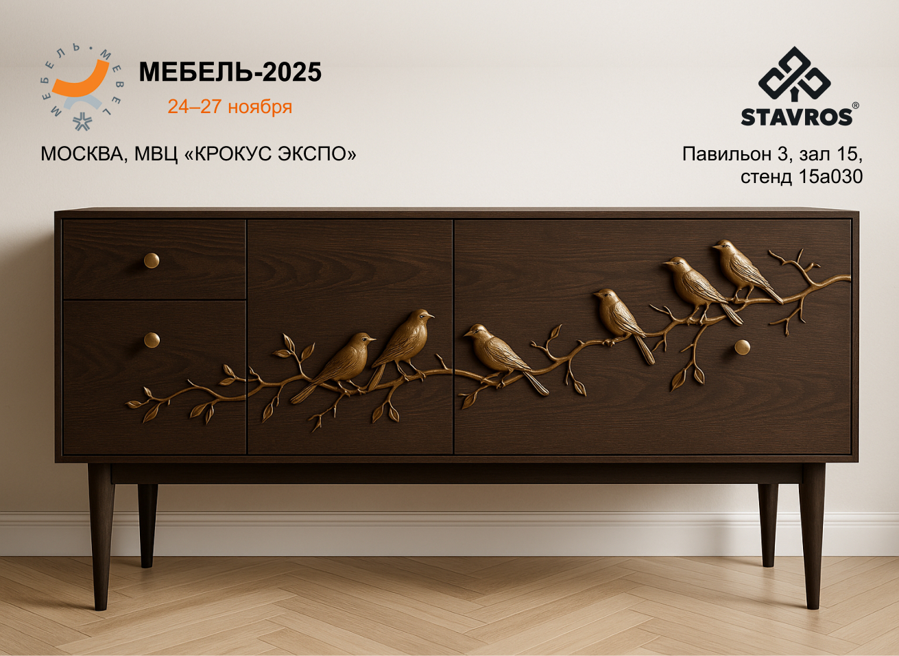 The event will take place in Moscow, at the Crocus Expo exhibition center, Hall 3. At the STAVROS stand (Hall 15, Booth 15A030) New collections of wooden decor, furniture components, and interior solutions will be presented, showcasing the high level of design and quality of Russian production.