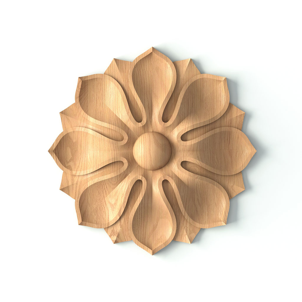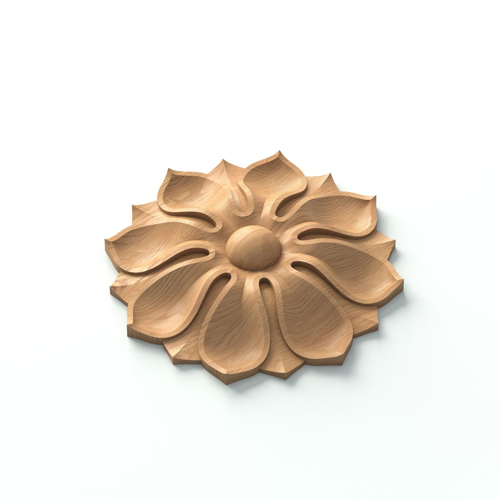 Relief decorative rosette R-002 in the shape of a flower — a beautiful accent for furniture and interior. The minimalist design allows combining decor with any style, creating focal points in minimalist interiors or complementing carved compositions. The model is available in miniature and medium sizes. Carved rosettes R-002 are suitable for decorating facades, doors, cabinets, sofas, ceilings, wall panels, stair posts, pilasters, as well as children's furniture. Some sizes are available in stock.