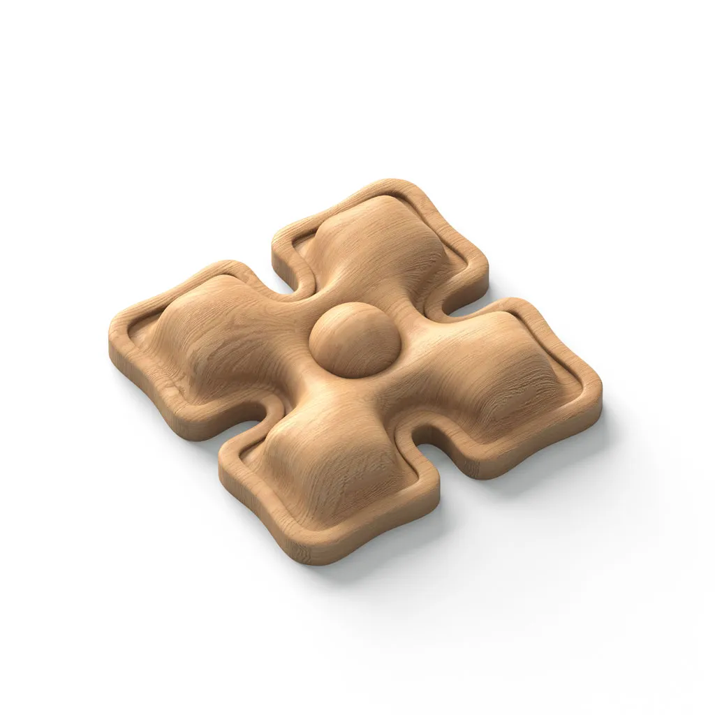 Wooden Surface Rosette R-040 — a simple decorative element in the shape of a four-leaf clover in a gothic style. Looks great on doors, ceilings, wall panels, and stair posts. Can be an unusual accent for projects in modern styles. Naturally fits into loft, industrial, and grunge interiors. The standard grid includes optimal sizes for various design tasks. Wooden rosettes R-040 can be ordered in oak and beech.
