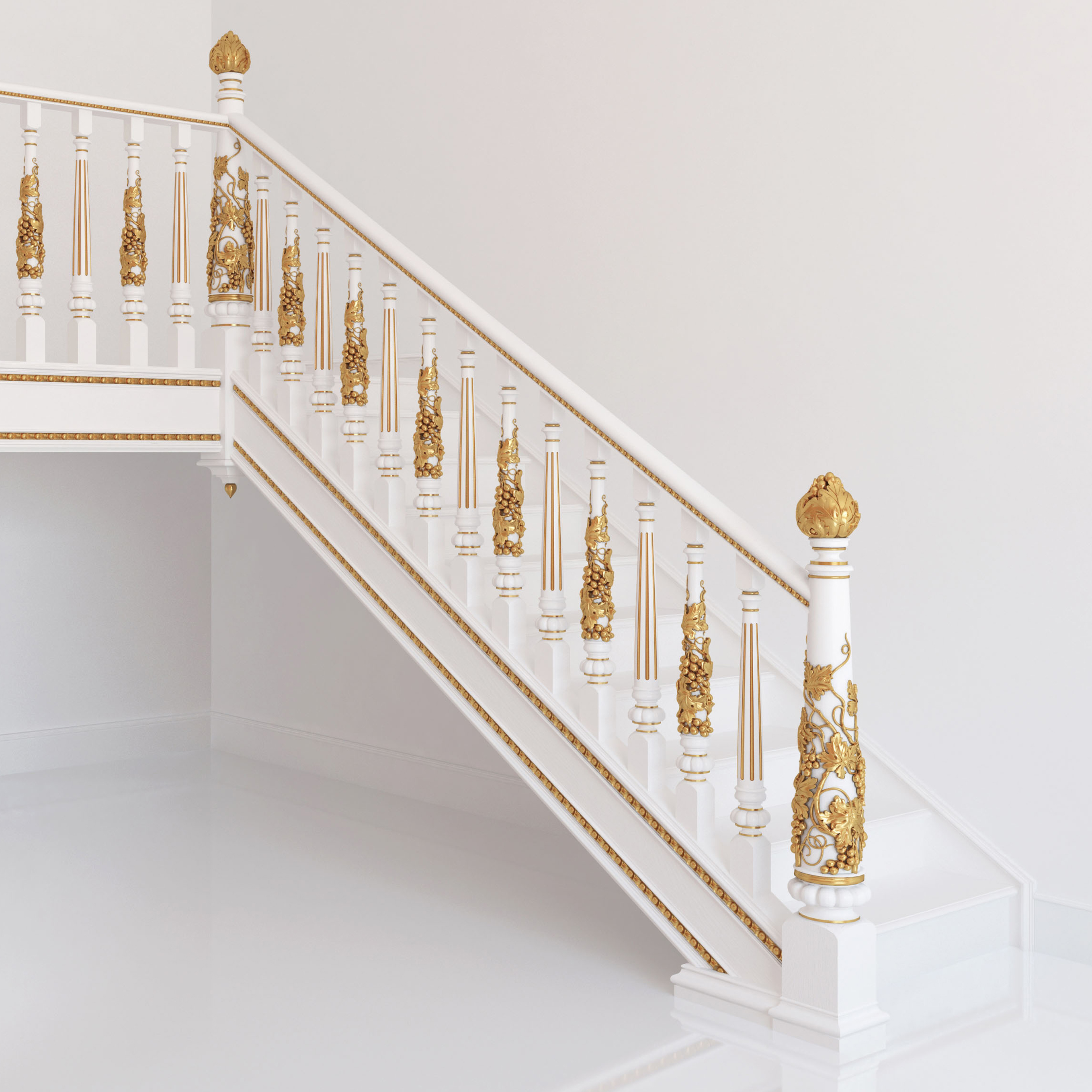 L-061 Carved Wooden Stair Post "Vine" — an exquisite and magnificent decoration for staircases in country houses, cellars, or themed restaurants. Often used in church-style settings. Harmoniously combines with L-059 balusters from its collection. Also looks great with more modest elements featuring L-060 moldings. Semi-transparent finish will highlight the beauty and realism of the vine ornament, while dense enamel with gilding will make the stair post even more luxurious.