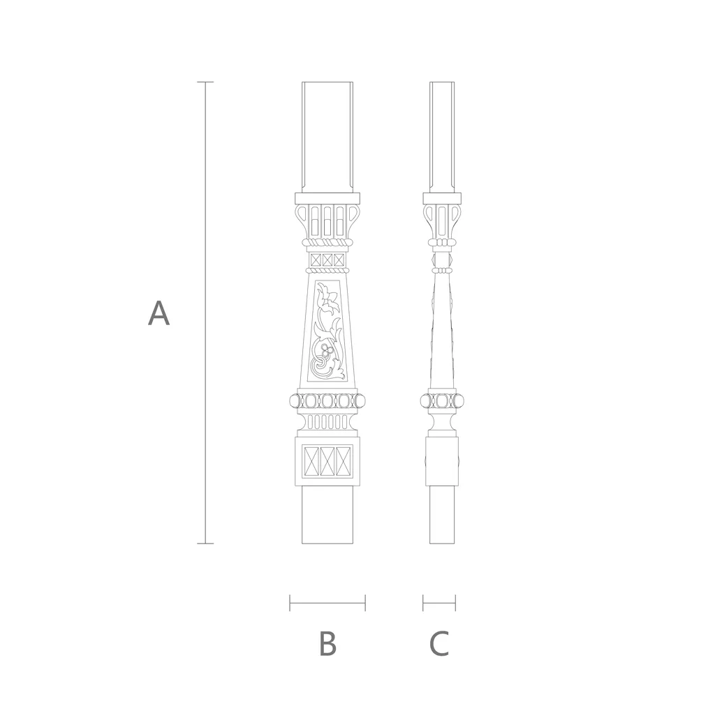 Model L-009.1 is a wooden baluster designed in a Russian style. Thanks to its width and predominance of rectangular forms in its design, this baluster has a sturdy and solid appearance. The grass and flowers in the central part of this model evoke beautiful Russian landscapes.