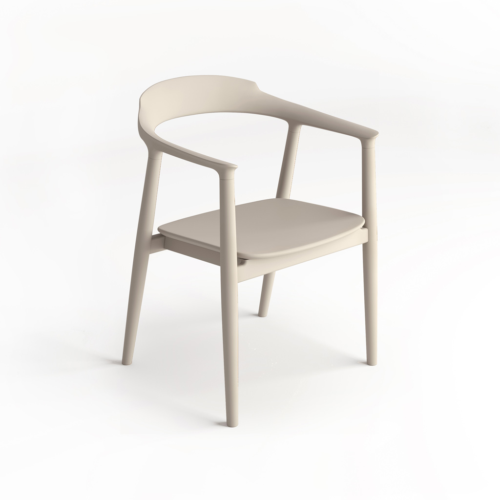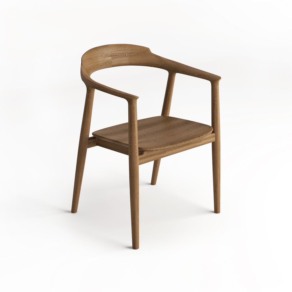 HANS Chair Designed in the traditions of Scandinavian minimalism with an emphasis on functionality and natural materials. It features elegant geometric forms and fluid lines. The armrests smoothly transition into the backrest, forming a single semicircle supported by four delicate turned legs.