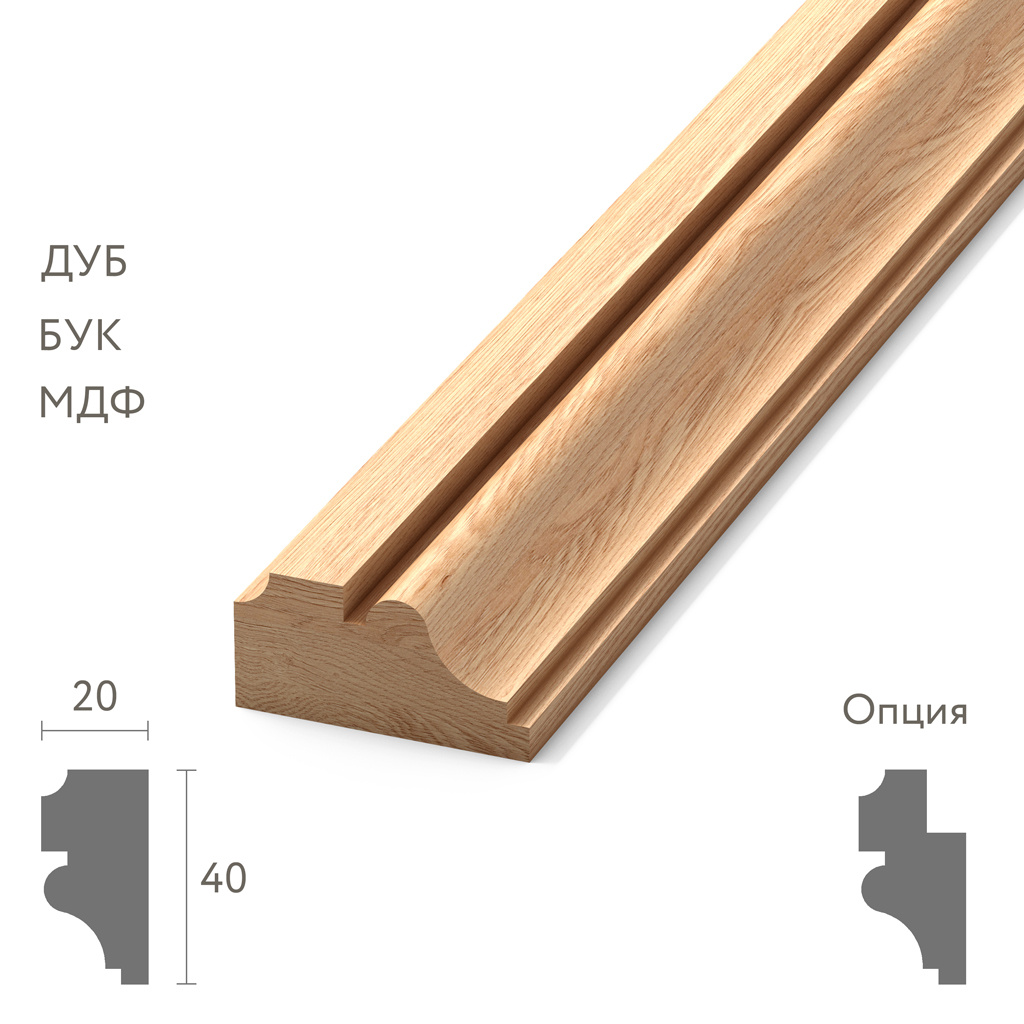 Декоративный молдинг 40×20 представляет оптимальное архитектурное решение с сбалансированными пропорциями, созданное для интерьеров и мебельного производства, где важна надежная детализация и выразительное визуальное воздействие элементов. Изготовленный из отборного массива дуба, европейского бука высшего качества и технологичного МДФ, этот деревянный молдинг 40×20 объединяет функциональность с надежной эстетикой оптимального четвертькруглого профильного сечения.