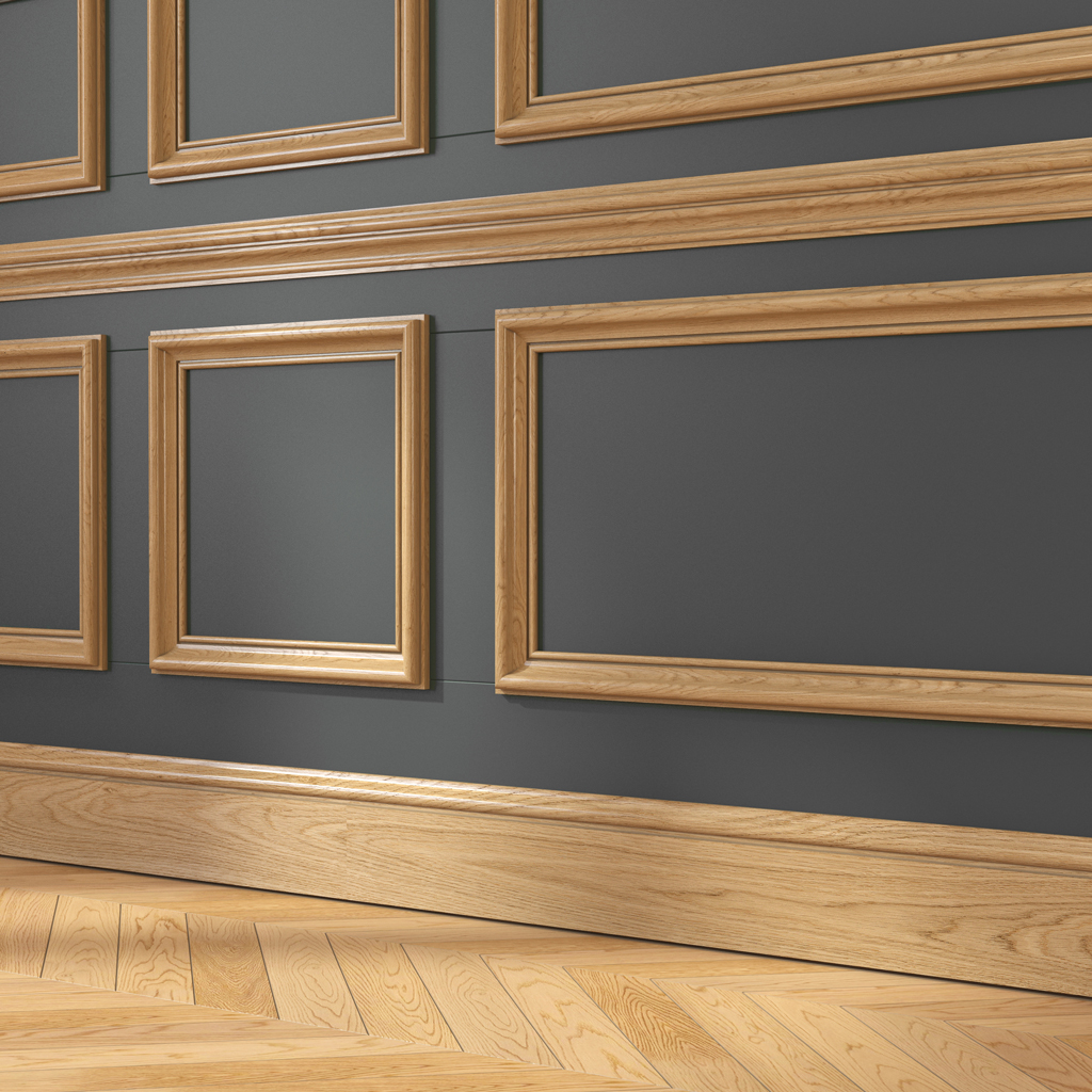 Плинтус из дуба с классическими лаками создает выразительные линии для традиционной элегантной отделки благородного дизайна и ампирного стиля классического уровня. Дополняется наличниками широких сечений для создания надежных архитектурных композиций.