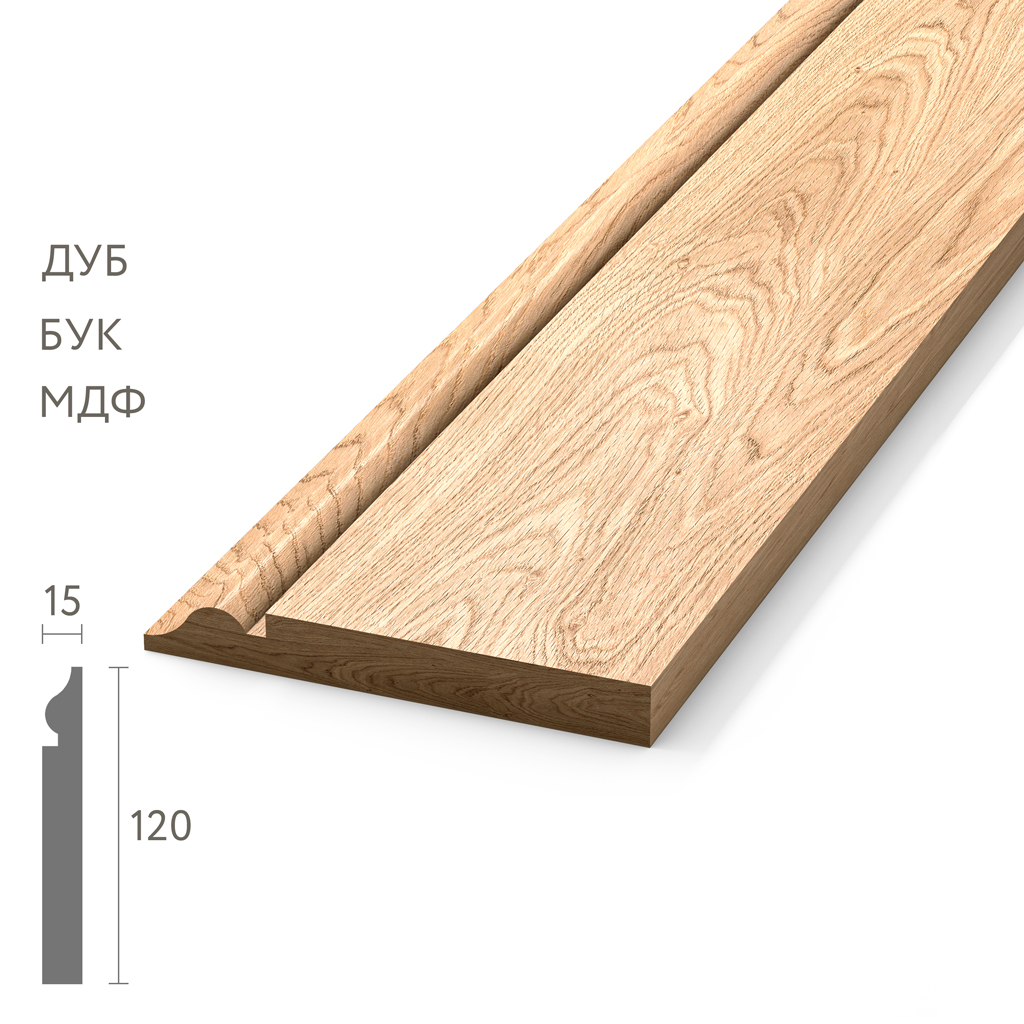 Напольный плинтус 120×16/15 представляет классическое архитектурное решение с выразительными пропорциями и традиционным профилем, созданное для интерьеров и строительных объектов, где важна надежная визуальная граница между стеной и полом с элегантным декоративным воздействием. Изготовленный из селективного массива дуба, европейского бука высокого качества, обычного и влагостойкого МДФ, этот деревянный плинтус 120×16/15 объединяет функциональность с классической эстетикой широкого напольного профильного сечения.