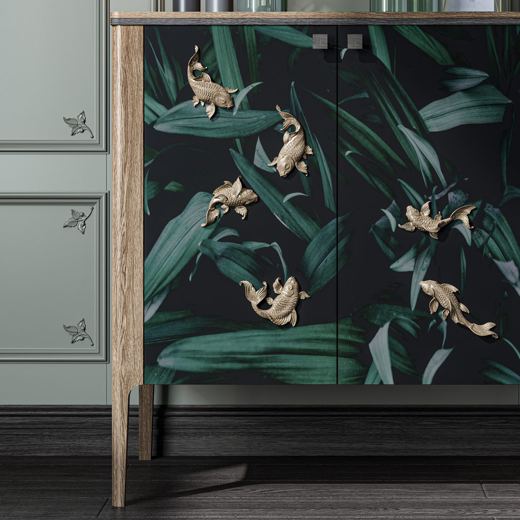 Изысканный дизайн: Форма рыбки и детализированная резьба делают накладку ярким акцентом в интерьере. Она добавляет пространству динамичность и природную гармонию, делая его более выразительным.