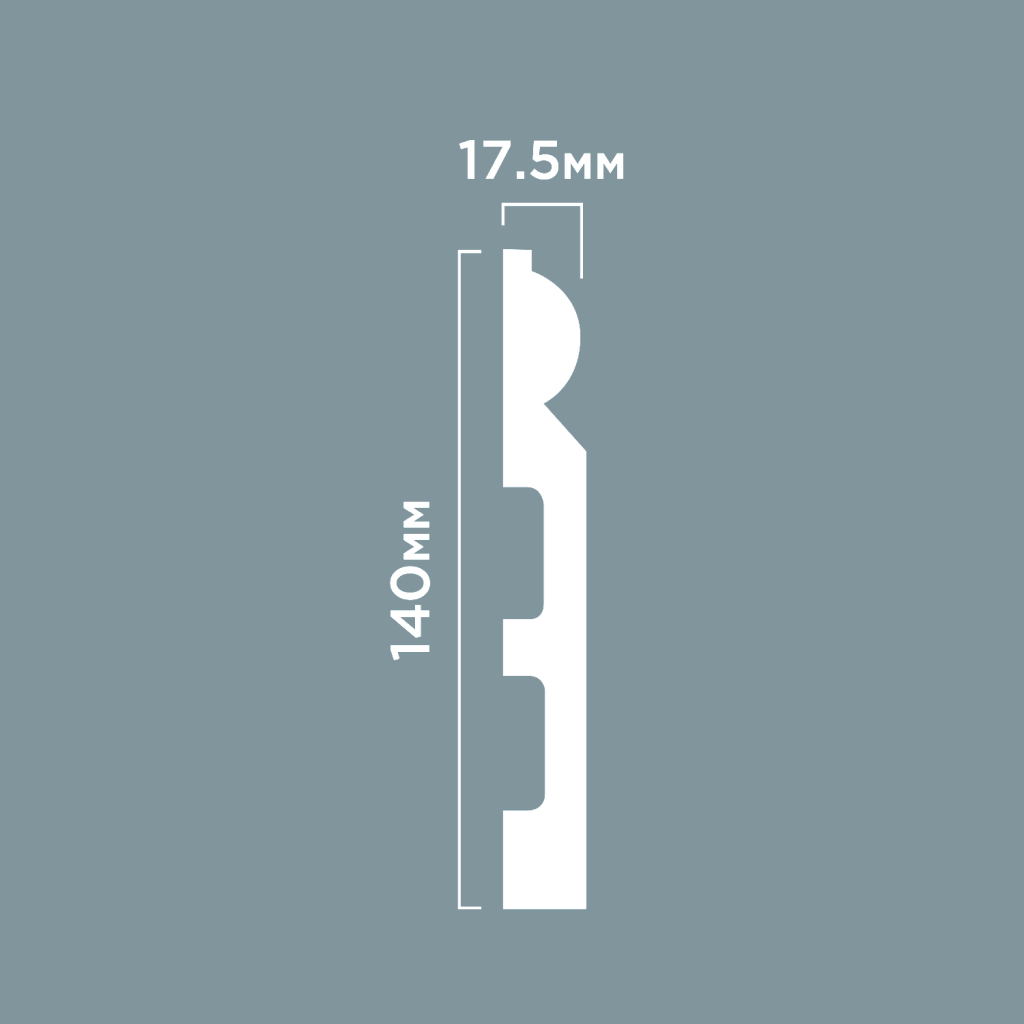 Thickness of 17.5 mm represents an increased value that ensures maximum enhanced rigidity of the absolutely record-high profile of 140 mm and creates a super-reliable wide mounting surface for applying a significant amount ofadhesive for polystyrene baseboards. This increased thickness is critically important for the maximum height profile — it unconditionally guarantees that the baseboard will not bend during installation even on walls with unevenness up to 5 mm, reliably maintains the specified straight-line shape after installation throughout the entire multi-year service life, and creates a robust long-lasting connection with the wall over the entire impressive height of 140 mm for many decades of flawless service.