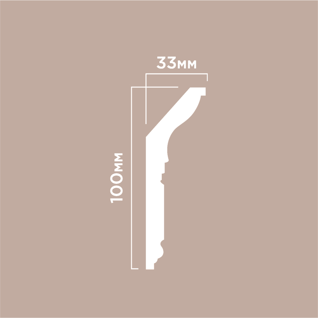 The white surface of the trim with a flawless texture creates an ideal transition between wall and ceiling, giving the interior architectural completeness and visual elegance. The profile is designed with classic proportions characteristic of European architectural tradition, where smooth transitions between relief levels form a noble play of light and shadow. The increased height of 100 millimeters makes the trim a noticeable decorative element capable of visually increasing the room's height, while the moderate width of 33 millimeters preserves elegance and does not overload the space with bulk.