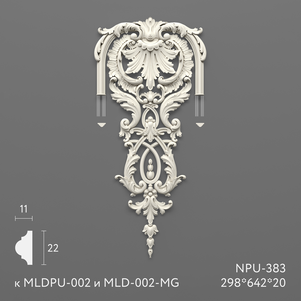 The carved polyurethane applique NPU-383 is a decorative element designed for decorating interiors and facades. The polyurethane from which it is made is characterized by high strength, resistance to external influences, and durability. This material allows creating elegant and detailed elements that beautifully imitate classical wood carving.
