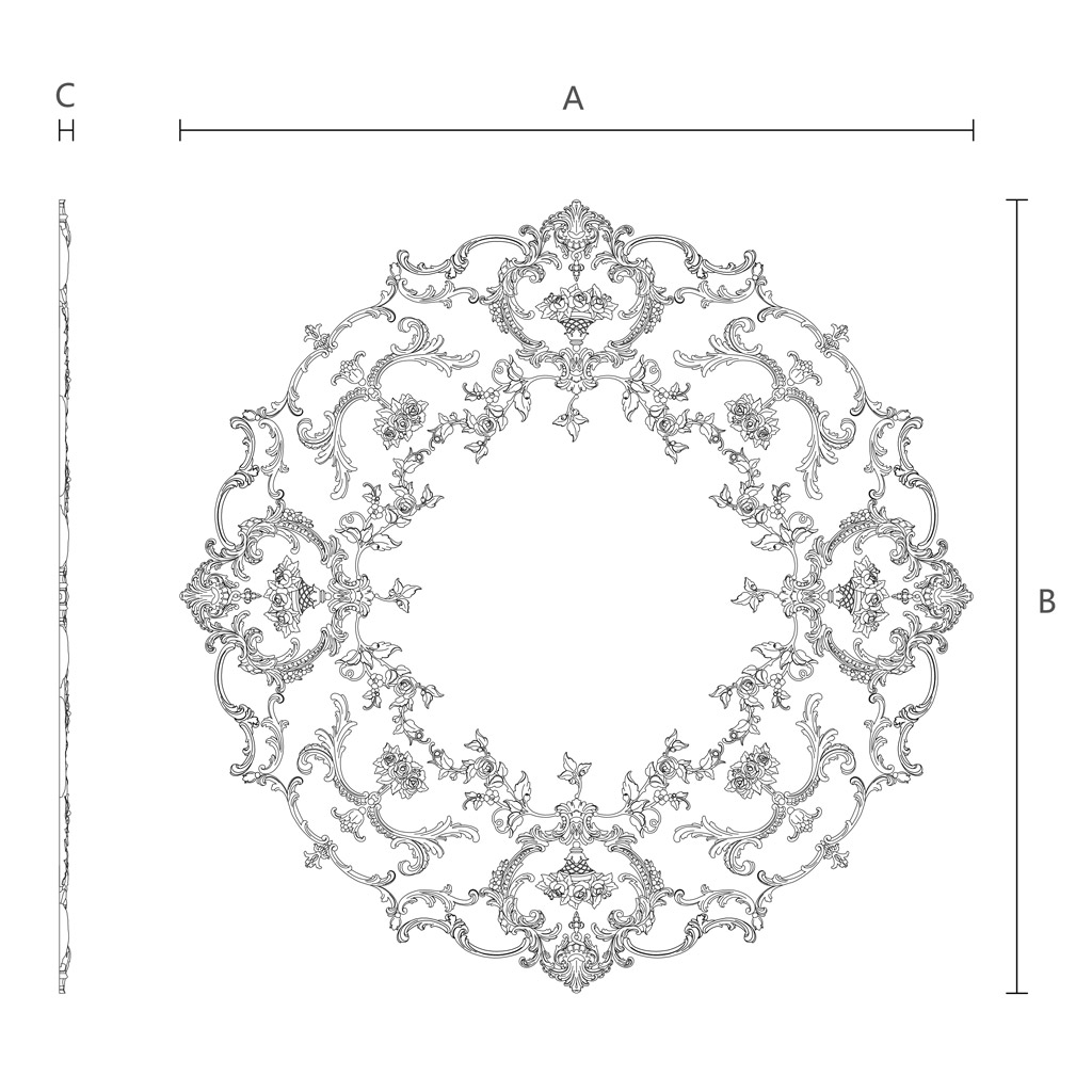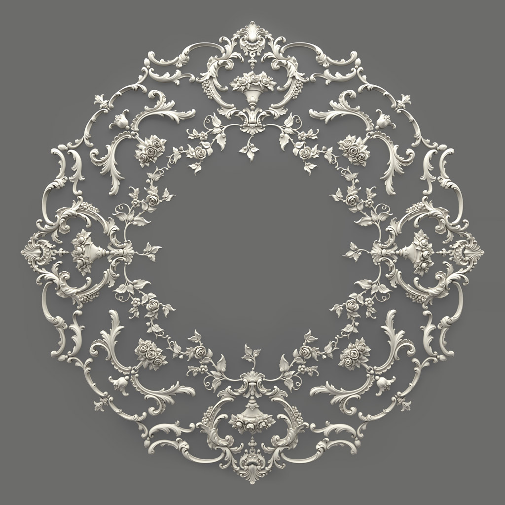 The ornamental composition of CPU-066 is executed in the style of high baroque with rococo elements, making it universally suitable for classical and neoclassical interiors. The central motif is a stylized rosette surrounded by symmetrical acanthus and grapevine scrolls.