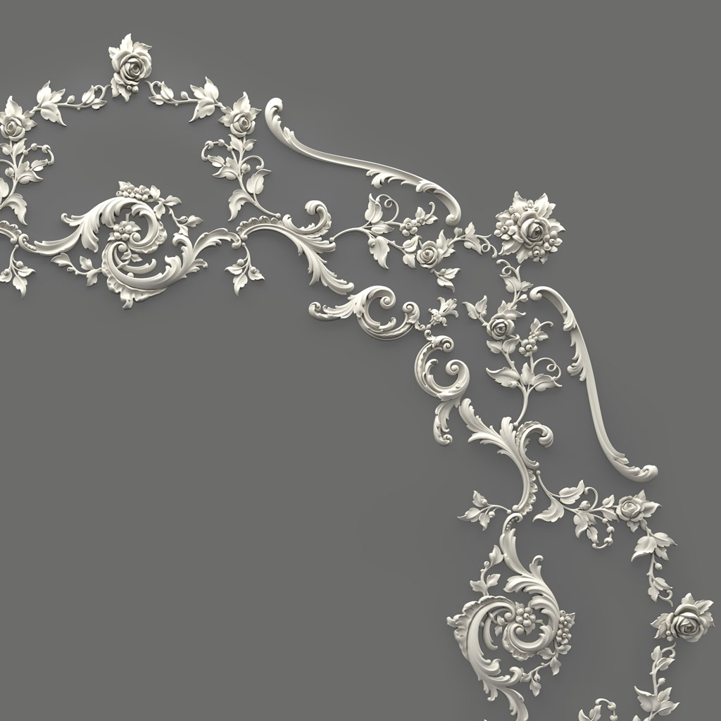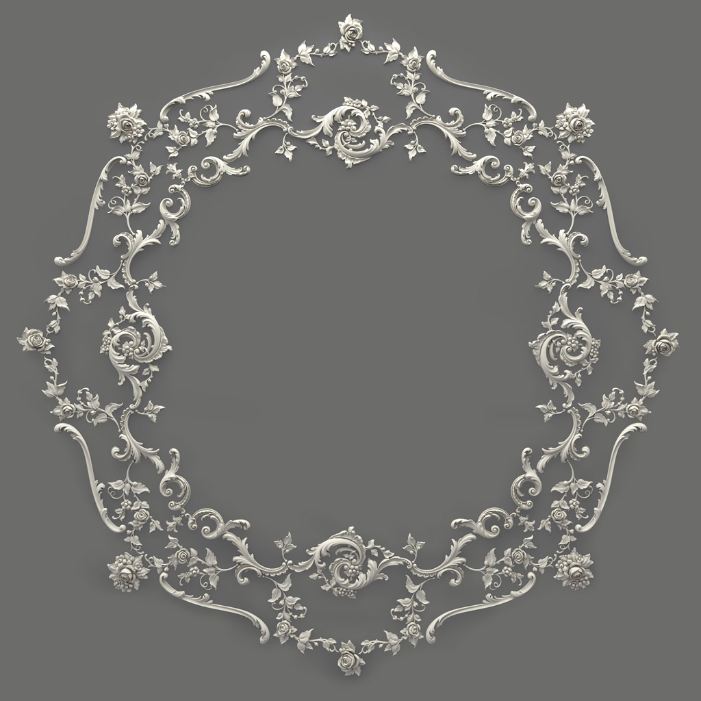 The concept of CPU-067 molded decoration is based on principles of classical European ornamentation with a pronounced influence of Baroque and Rococo styles. The central motif of the composition is a complex rosette with plant elements, from which decorative fragments radiate outward, creating a rhythmic and dynamic structure of the ornament.