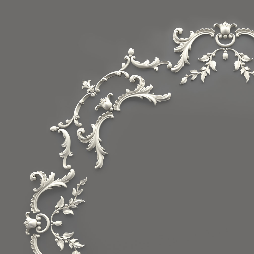 The ornamental program of CPU-068 represents an elegant interpretation of classical vegetal motifs of European decorative art. The composition is based on stylized vegetal forms with a predominance of acanthus leaves, grapevine, and rose motifs.