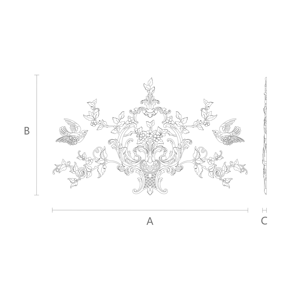 On the schematic drawing, you can see that the composition has significant width (A) and height (B), while the thickness (C) does not appear bulky. This shape allows using relief decoration CPU-047 as a central element on a large wall or ceiling, as well as as an elegant frame above a door opening or fireplace. If you want to add a real "wow" effect to the room, this decoration will be an ideal choice.