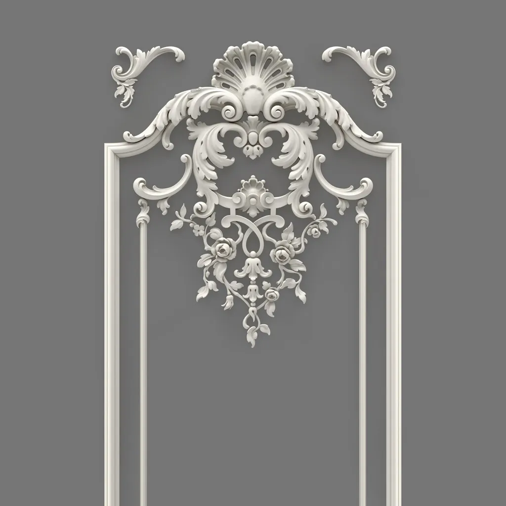 Relief Decoration CPU.VRS-060 is a complete set of several elements that, when combined, form a tall and narrow decorative panel. This panel can be used on walls, doors, and under certain conditions — even on facades. Thanks to its complex ornamentation, including floral motifs, scrolls, shells, and other classical details, this decoration immediately attracts attention and becomes the central accent of the space.