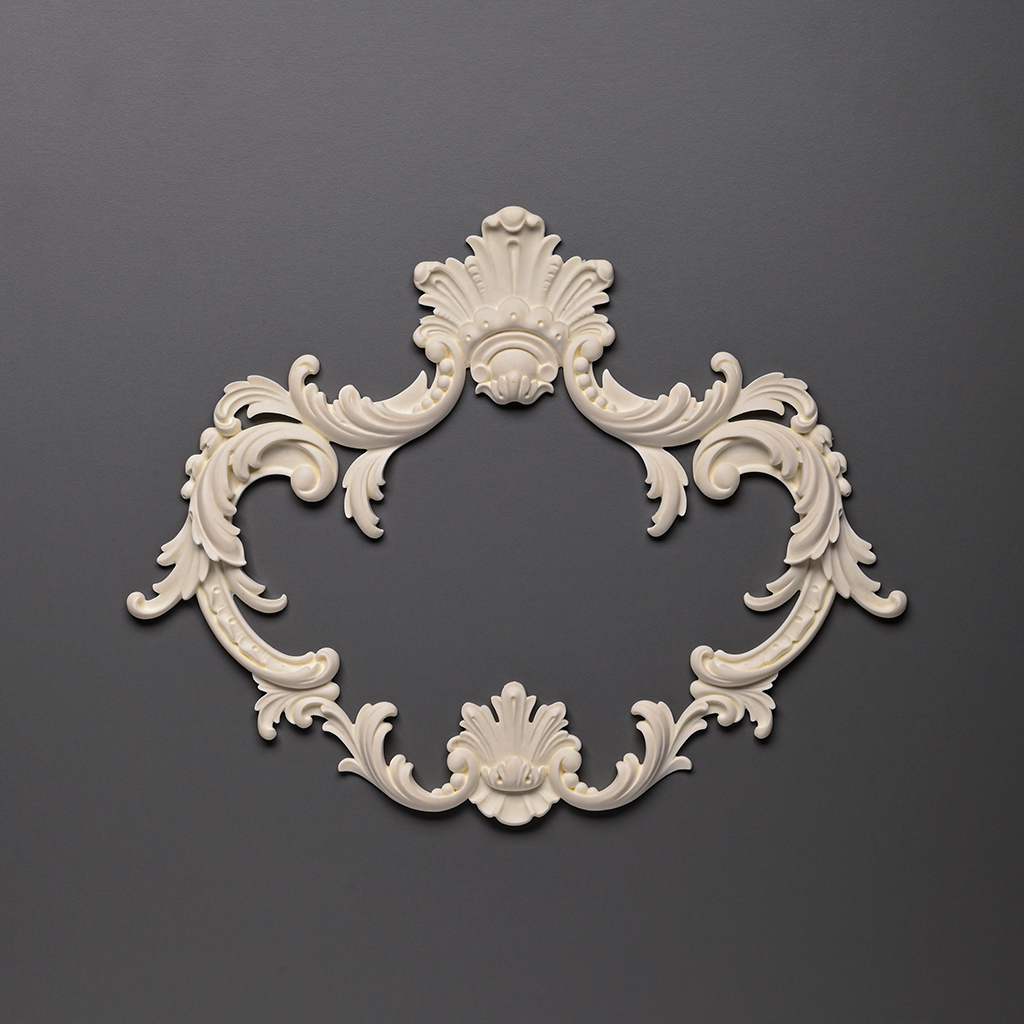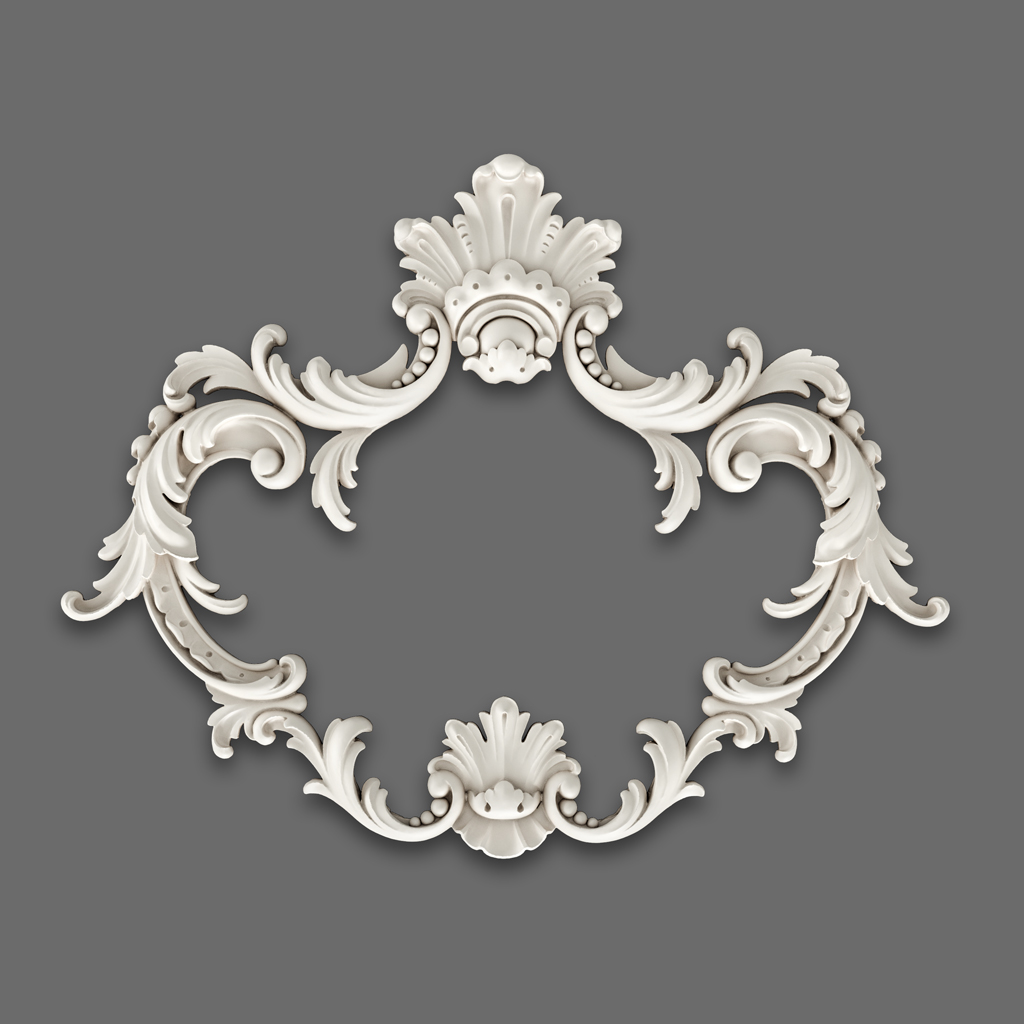 Plaster Decor NPU-463.1 is designed as a curved frame, characteristic of the Baroque era. The central part of the ornament resembles an empty 'window' or oval, framed by intricate scrolls, plant elements, and voluminous acanthus leaves. The upper and lower elements feature expressive relief, adding a sense of grandeur. The combination of smooth lines, shells, and acanthus leaves creates a rich composition that can become a central accent in any room.