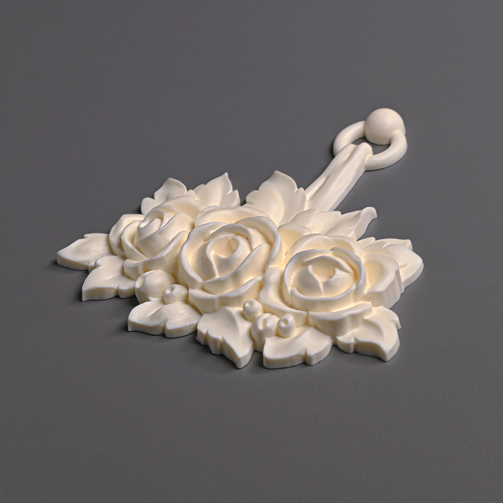 As seen in the schematic drawing (where parameters A, B, and C are marked), the decoration has an elongated shape: width (A) roughly corresponds to the bouquet’s dimensions, while height (B) includes the space above the roses and the decorative ring. Thickness (C) allows achieving a pronounced relief without excessive protrusion. Upon closer inspection, one can notice how meticulously the petals and leaves are detailed, making the composition realistic and adding depth.