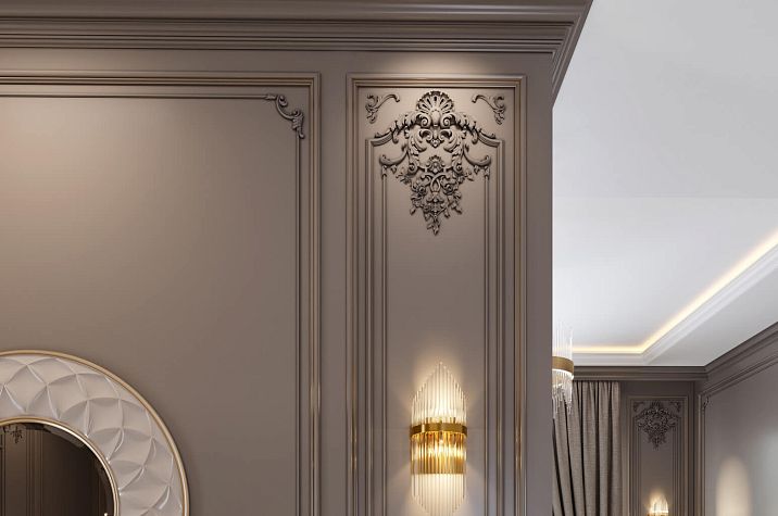 Art Deco style combines luxury with geometry and symmetry. Panels with geometric relief, moldings with angular profiles, decorative elements in the form of zigzags, steps, and sun rays are used. Vertical compositions are characteristic, emphasizing the height of the room.