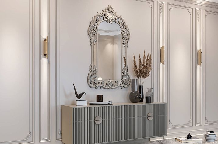 In a classical interior, it is characteristic to use wall panels framed by moldings, pilasters with capitals, rosettes, and decorative appliqués with vegetal motifs. Symmetrical composition, proportional elements, and rich ornamentation create an atmosphere of solemnity and luxury.