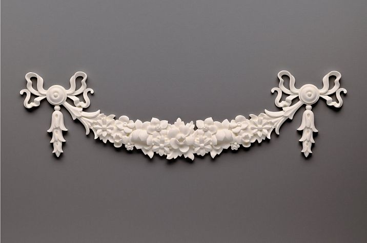 Decorative appliqués – small three-dimensional elements with vegetal, geometric, or figurative ornamentation – are used to create complex compositions, embellish panels, and complement moldings and panels. Appliqués are mounted over the main decoration, creating a multi-layered relief surface.