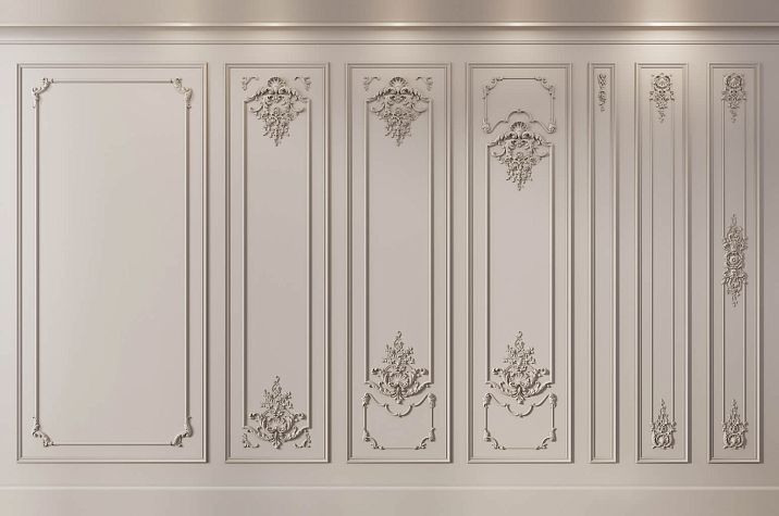 Wide sets in the 650 × 2300 mm format create full-format Versailles wall sections with maximally rich ornamental decoration: horizontal decorative belts structure the internal field, central medallions fill it with sculptural content, frame ornamental overlays create an additional ornamental level, corner accents detail all transitional nodes of the system. Medium-format sets 300 × 2300 mm provide a full ornamental program in a compact width — an optimal solution for narrow wall sections, framing openings, and independent decoration of small rooms. Narrow strips 150 × 2300 mm work as elegant rhythmic dividers or independent accent verticals in spaces where wide formats are inappropriate.