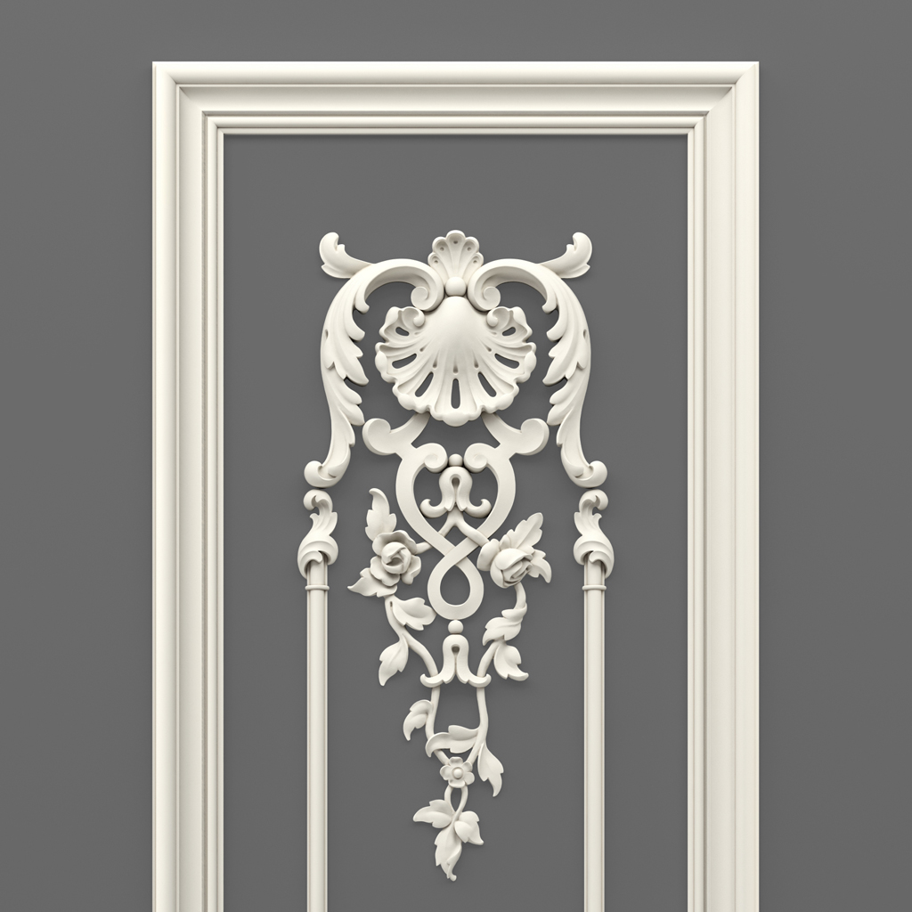 The polyurethane decor NPU.VRS-005 is the ornamental heart of the CPU-5-7 kit and deserves detailed consideration as an independent artistic product. The vertical orientation of this element — a height of 321 mm with a width of 150 mm, an aspect ratio of 1:2.1 — is its fundamental characteristic, distinguishing it from the central medallions of the wide panels in the series, which have approximately square or slightly vertically elongated proportions. NPU.VRS-005 is precisely a vertical arabesque: the ornamental program of the element unfolds along the vertical axis, creating a narrative of ornamental ascent characteristic of pilaster and strip decors of Versailles. The ornamental vertical arabesque in the Versailles tradition is one of the oldest motifs of decorative art, dating back to antique grotesque decorations and experiencing its absolute revival in the decorative programs of French classicism and rococo. In grotesque ornaments, symmetrical plant shoots unfold along the vertical axis, creating an ornamental column of leaves, flowers, scrolls, and garlands, which, despite all its apparent complexity, is subject to a strict symmetrical logic: the left half is a mirror reflection of the right along the vertical central axis. It is precisely this principle that the ornamental program of NPU.VRS-005 reproduces. The relief depth of 16 mm — with an ornamental field width of only 150 mm — creates exceptional relief: the ratio of relief depth to field width is over 10%, which is a very high indicator of sculptural expressiveness for a decor of this scale. With side lighting — for example, from a window opening or a wall sconce — every scroll, every leaf, and every detail of the ornament casts its own shadow, and the entire surface of the element comes alive in a dynamic play of light and shadow, which, when viewed from a distance of three to four meters, creates an illusion of relief significantly greater than 16 mm.
