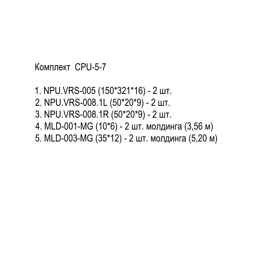 The CPU-5-7 kit creates a vertical wall panel with overall dimensions of 300 × 2300 mm and a maximum relief depth of 16 mm — the central decor NPU.VRS-005. Full component composition: primed MDF molding MLD-003-MG, profile 35 × 12 mm, length 2600 mm — one unit; primed MDF molding MLD-001-MG, profile 10 × 6 mm, length 2600 mm — one unit; polyurethane molded decor NPU.VRS-005, size 150 × 321 × 16 mm — one piece (for central single application) or several units for a vertical row; polyurethane molding NPU.VRS-008.1L, size 50 × 20 × 9 mm — one piece; polyurethane molding NPU.VRS-008.1R, size 50 × 20 × 9 mm — one piece. Overall panel width — 300 mm. Height — 2300 mm. Maximum relief depth — 16 mm (NPU.VRS-005). All components are supplied with factory white acrylic primer, ready for application of final paint coatings without additional surface treatment. Compatible with all types of water-based, acrylic, and alkyd paints, as well as specialized decorative compositions for patination and aging.
