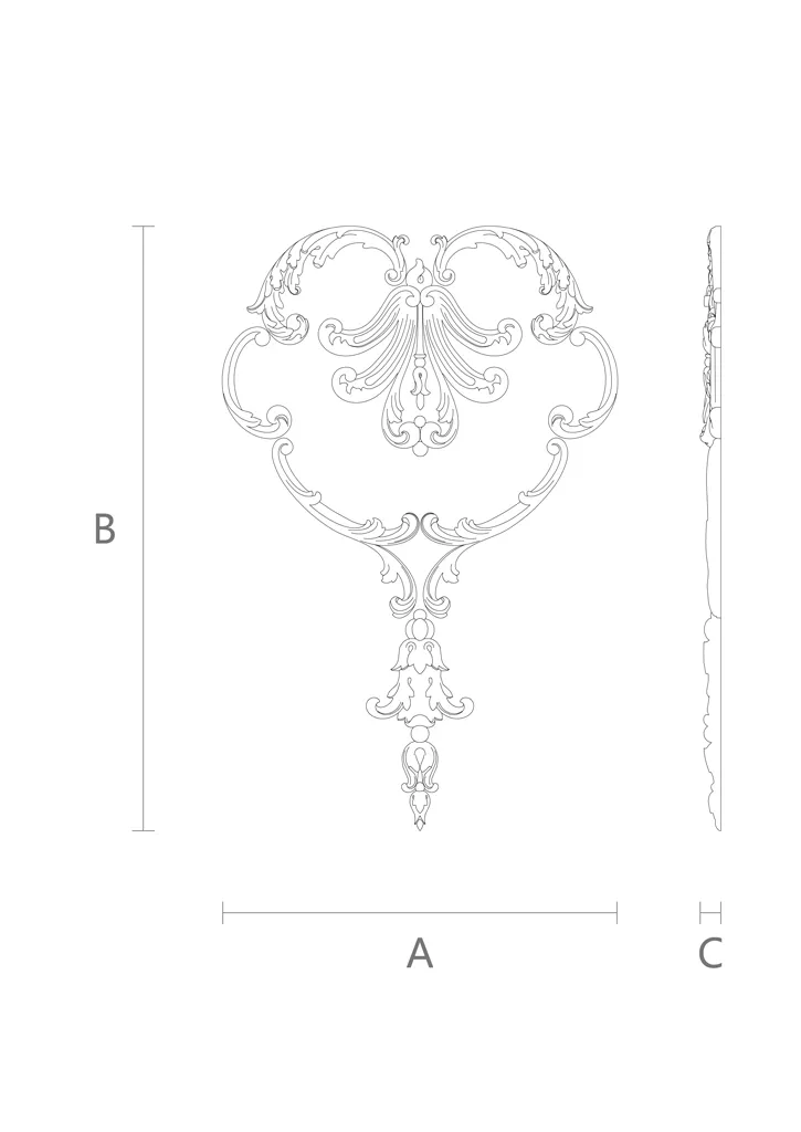 ● Carved appliqué N-288R. This appliqué has a right-side orientation. It can be used as a panel for a corner, leg, handle or other furniture. This appliqué is decorated with a plant ornament on the right side, creating an asymmetrical effect.