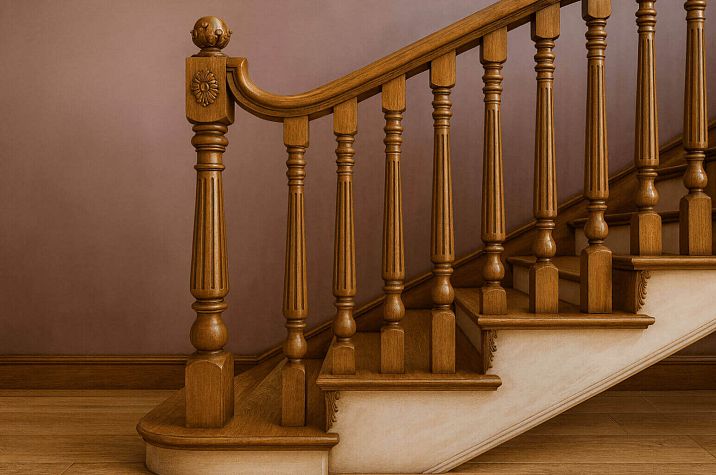 ● Handrails — these are horizontal rails that serve to hold your hand while ascending or descending the staircase. Handrails must be comfortable, reliable, and attractive. In Stavros, you can buy handrails from solid wood in various shapes, sizes, and finishes. You can choose straight, curved, carved, turned, smooth, or fluted handrails, with or without finials.
